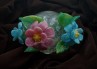 Clear with green leaves with blue, yellow and pink flowers