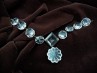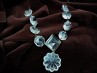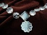 This strand is made up of eight flat back buttons, buttons approx. 18mm. In the centre of the strand is a crystal flat back 3 way divider, approx. 30mm, and coming off of the divider at the third point is a glass rosette, single pin hole approx. 30mm.